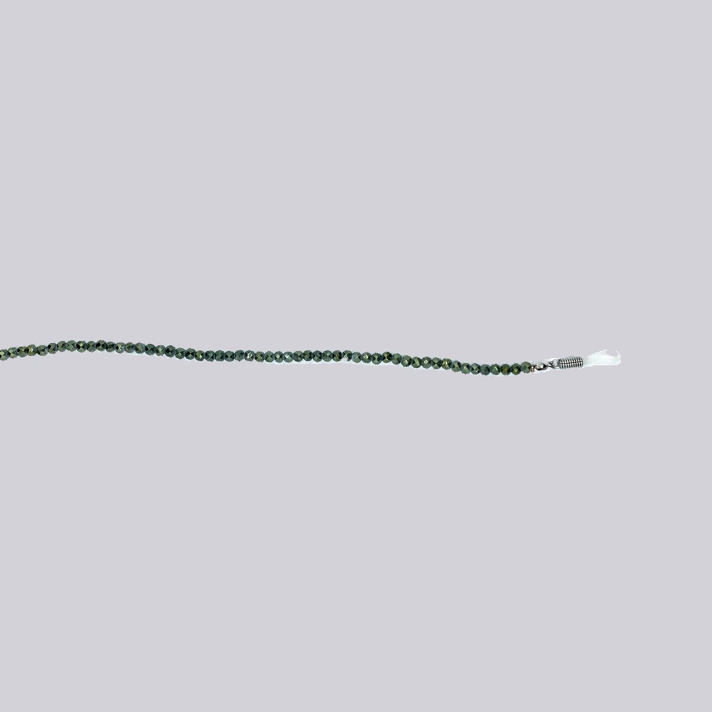 Handgefertigte Brillenkette aus geschliffenen, grünen Glasperlen.